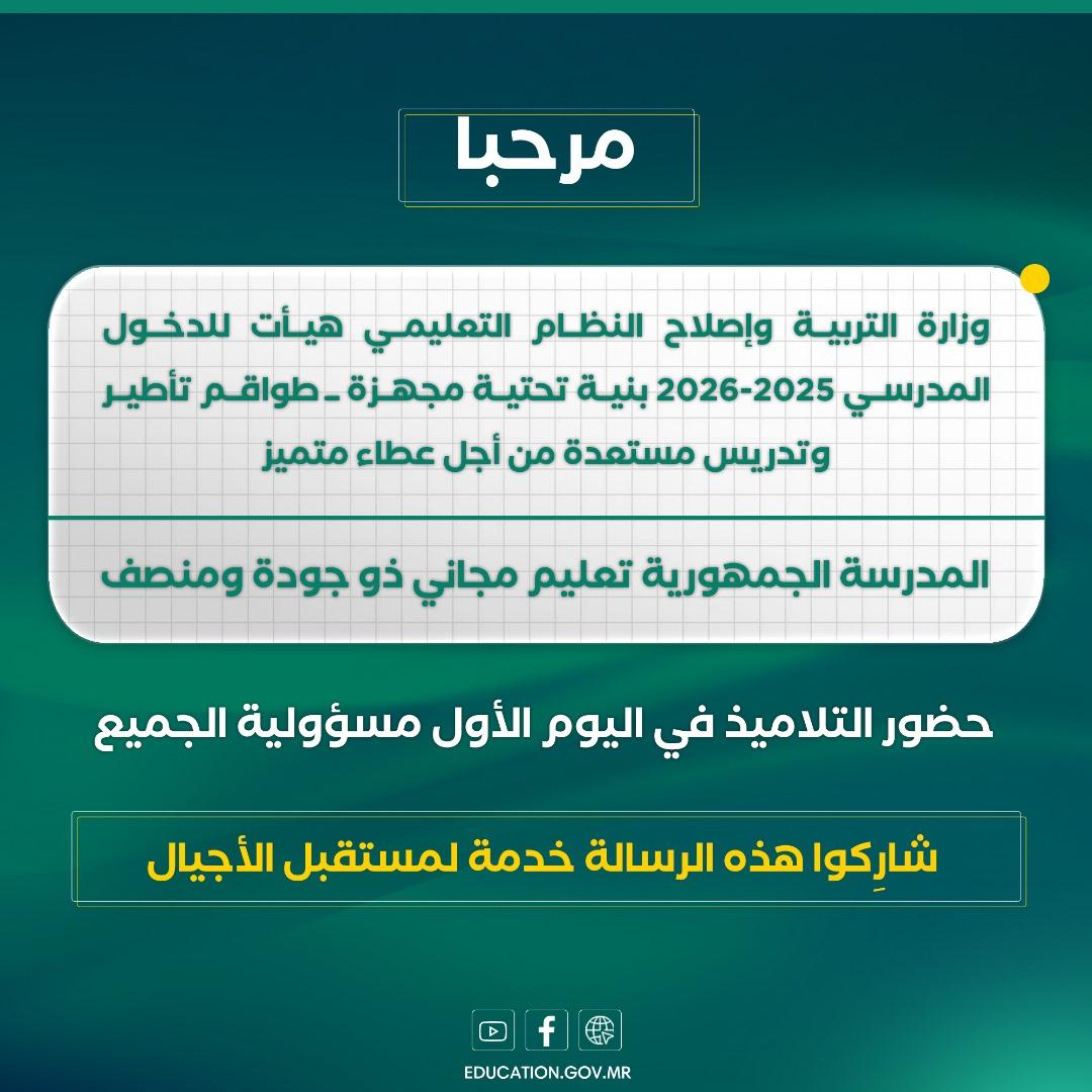 مع انطلاقة العام الدراسي الجديد 2025-2026، تؤكد وزارة التربية وإصلاح النظام التعليمي أن المدرسة الجمهورية تفتح أبوابها ببنية تحتية مجهزة، وأطر تدريسية مؤهلة، في سبيل توفير تعليم مجاني، عادل، ومنصف لجميع أبناء الوطن.