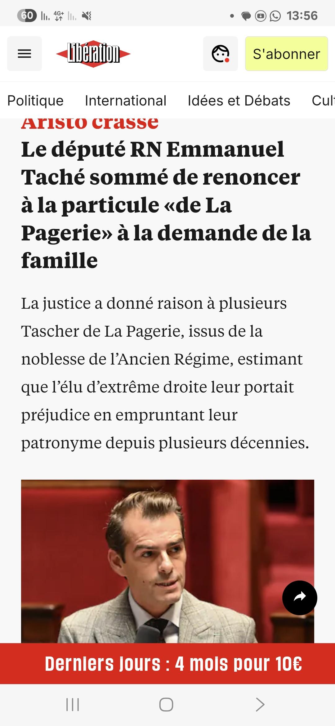في سابقة لافتة تشهدها الساحة السياسية والقضائية في فرنسا، ألزمت العدالة النائب عن حزب التجمع الوطني اليميني المتطرف (RN)، إيمانويل تاشيه، بالتخلي عن استخدام اللقب النبيل «دي لا باجيري»، وذلك استجابةً لطلب تقدمت به عائلة تاشر دي لا باجيري العريقة، المنحدرة من طبقة النبلاء في عهد النظام الملكي القديم.