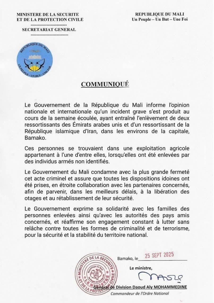 أعلنت الحكومة المالية، في بيان رسمي، عن اختطاف مواطنَين إماراتيين وآخر إيراني على أيدي مسلحين مجهولين، وذلك في ضواحي العاصمة باماكو الأسبوع الماضي.