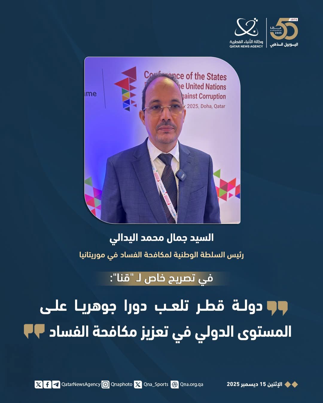 تشارك موريتانيا في أعمال الدورة الحادية عشرة لمؤتمر الدول الأطراف في اتفاقية الأمم المتحدة لمكافحة الفساد (COSP11)، التي تنطلق يوم غد الاثنين في العاصمة القطرية الدوحة، وتتواصل إلى غاية 19 ديسمبر الجاري، بوفد رسمي من السلطة الوطنية لمكافحة الفساد برئاسة رئيسها السيد جمال ولد اليدالي.